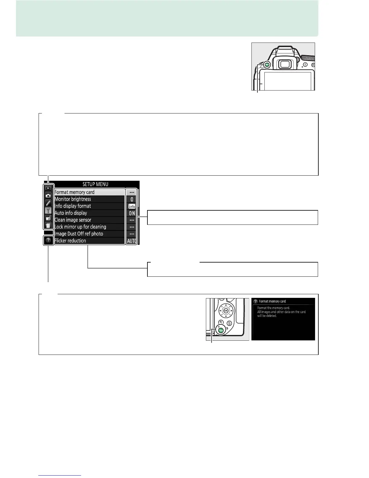 • C: Shooting (0 177) • m/O: Recent settings or My Menu (defaults