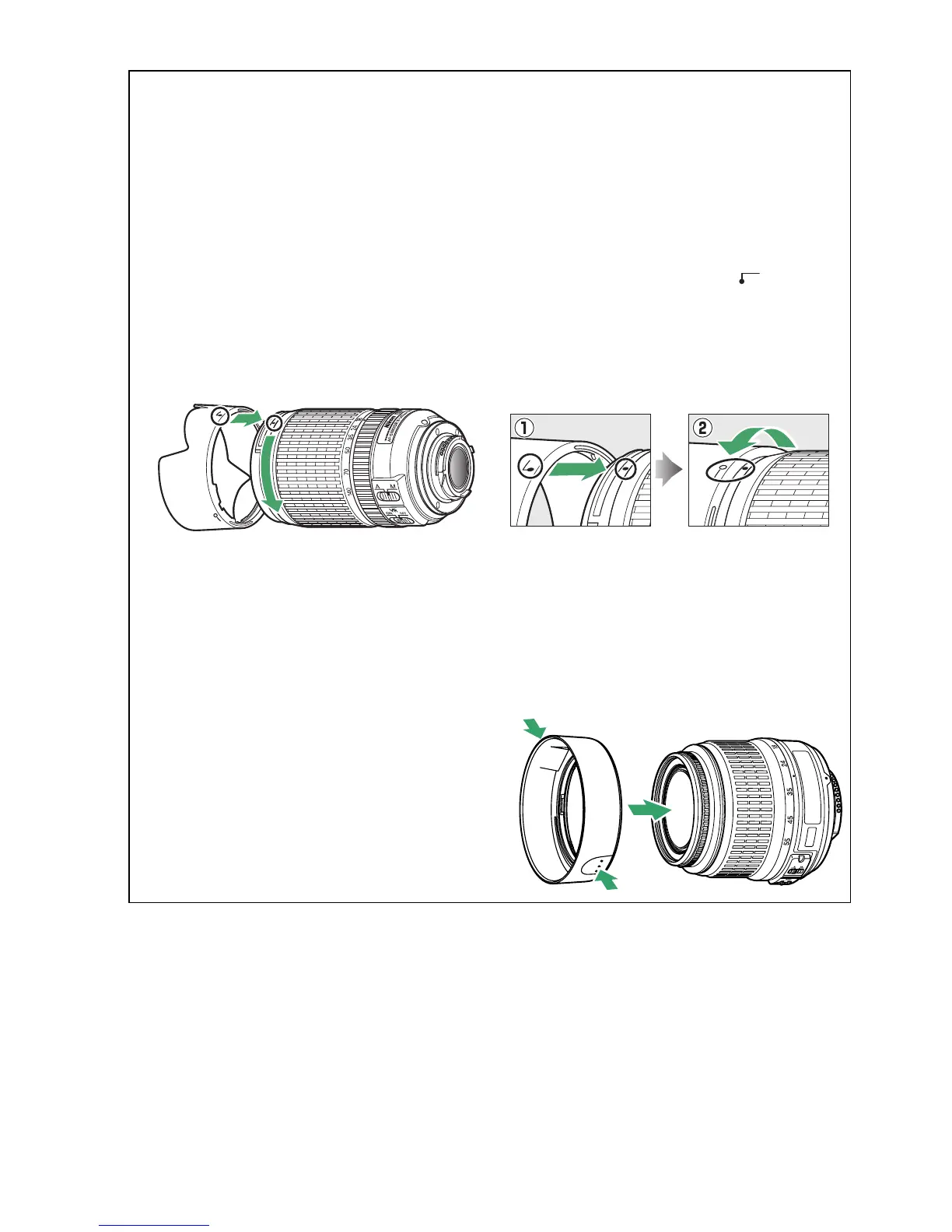 rotate the hood (w) until the ● mark is aligned with the lens hood lock mark (—{).