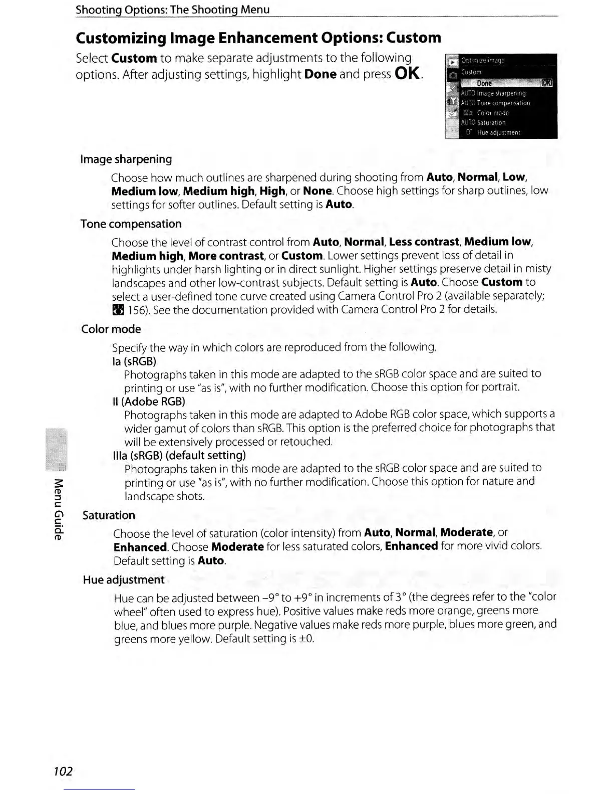 saturation (color intensity) from Auto, Normal, Moderate, or