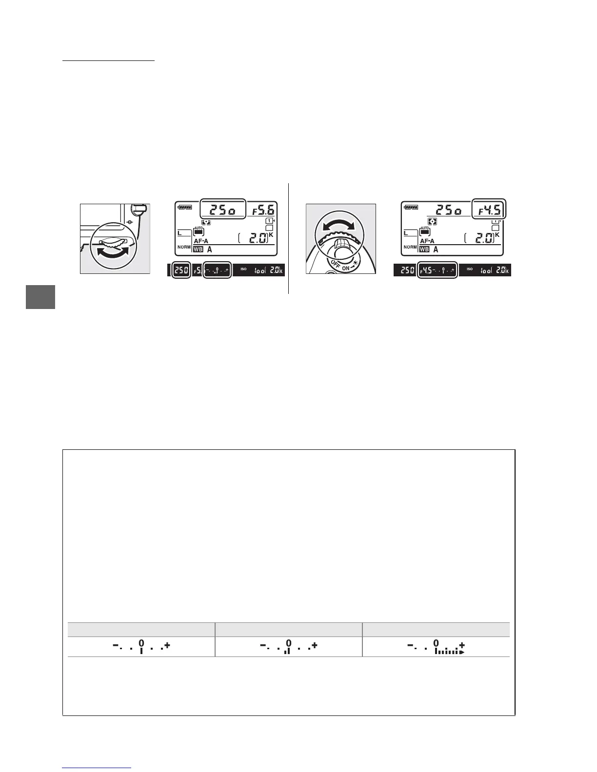 the right and positive values on the left, see Custom Setting f8 (Reverse indicators, 0 246).