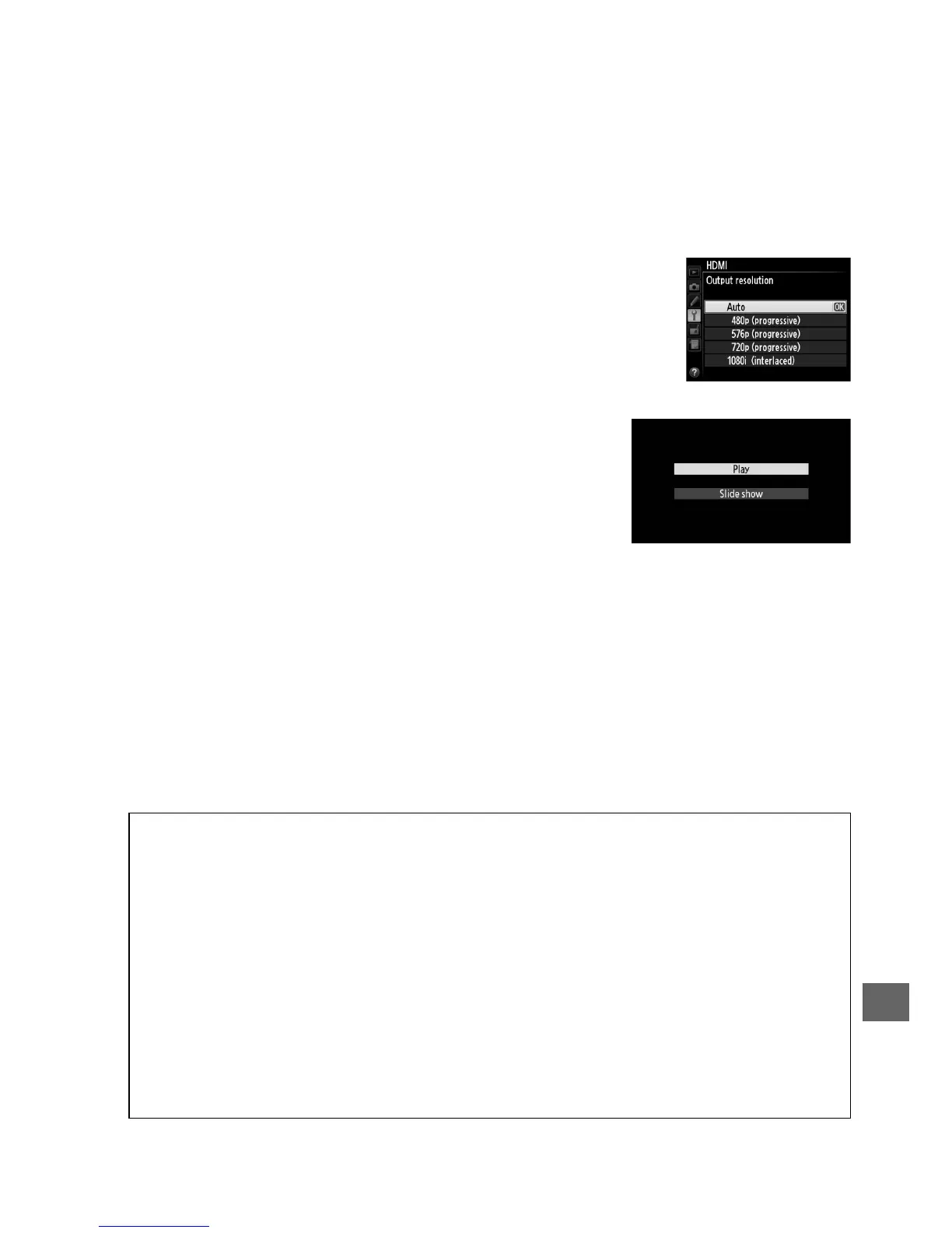 The HDMI option in the setup menu (0 249) controls output resolution and can be
