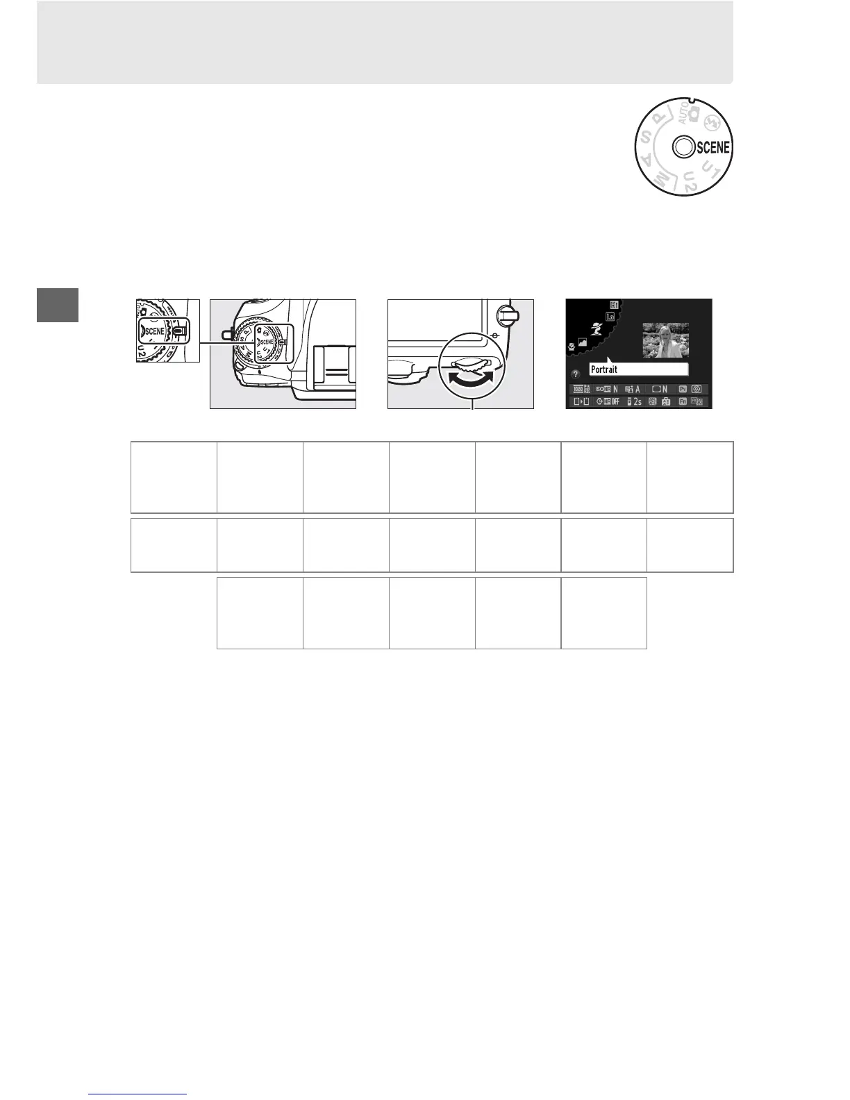 To view the currently selected scene, rotate the mode dial to h and press the R