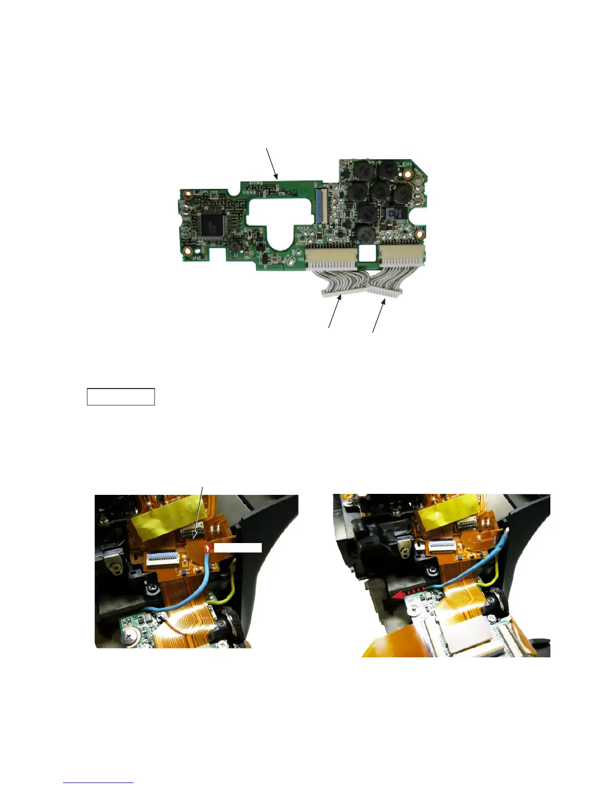 Pull this wire[Blue] of the battery contact unit (#B822) out from the gap between the main PCB and the