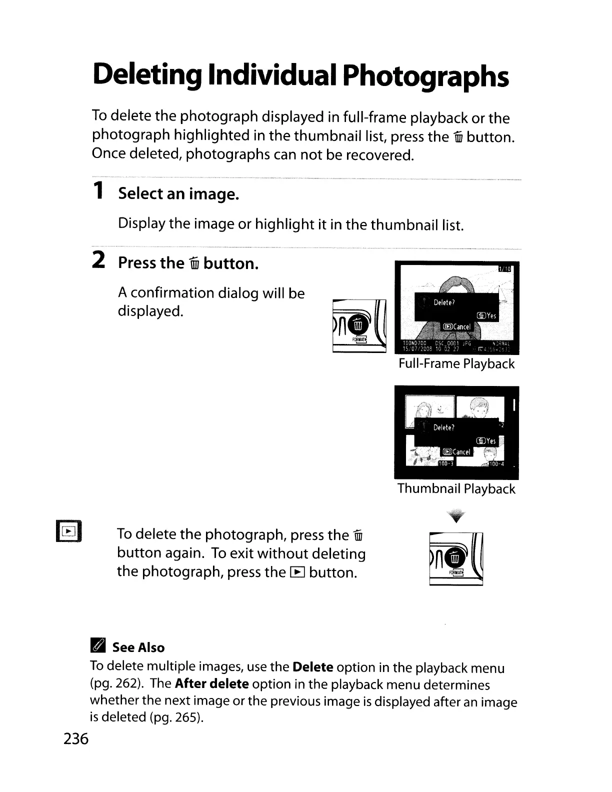 delete the photograph displayed in full-frame playback or the