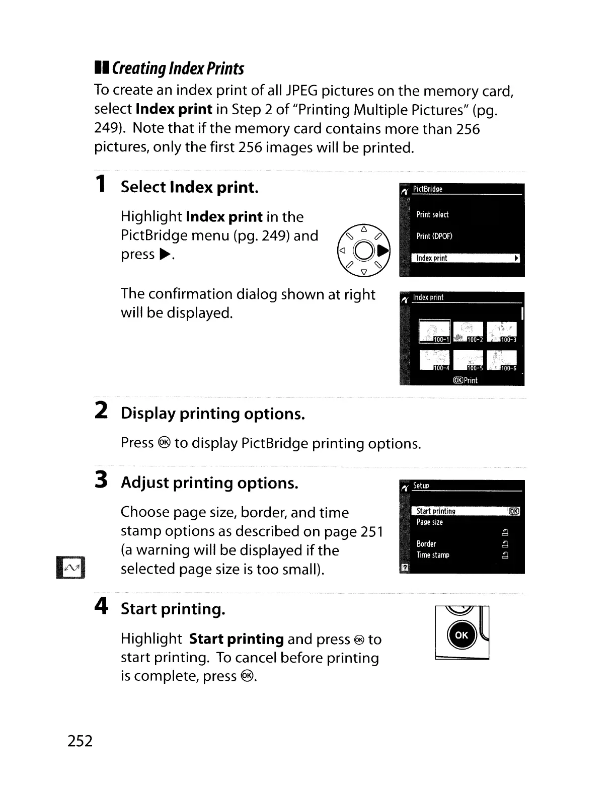 PictBridge menu (pg. 249) and