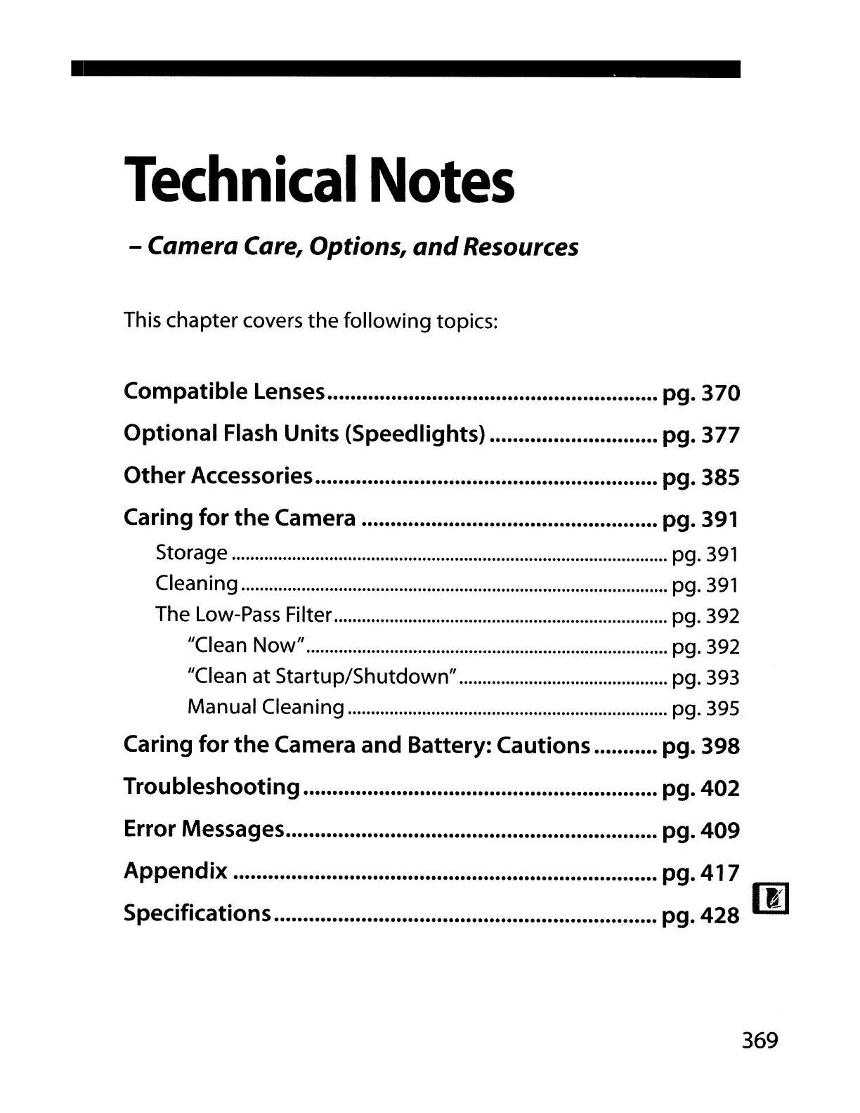 Camera and Battery: Cautions pg. 398