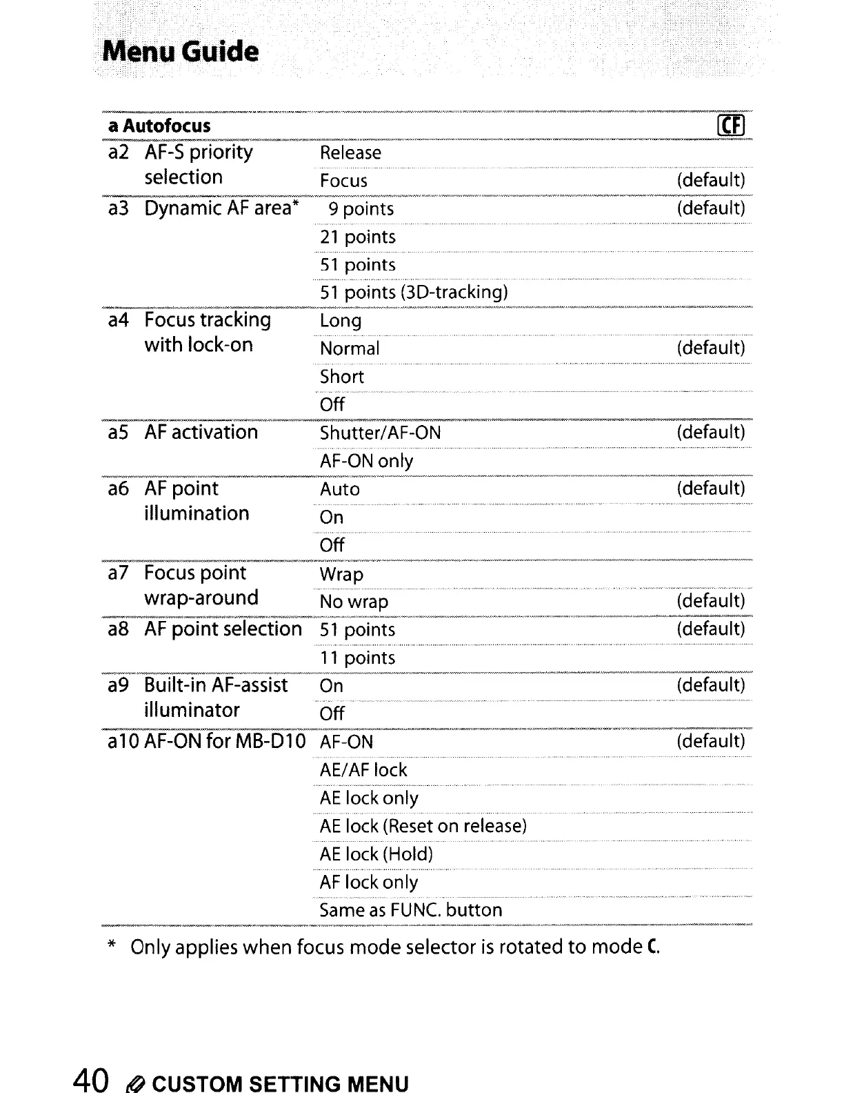40 0 CUSTOM SETTING MENU