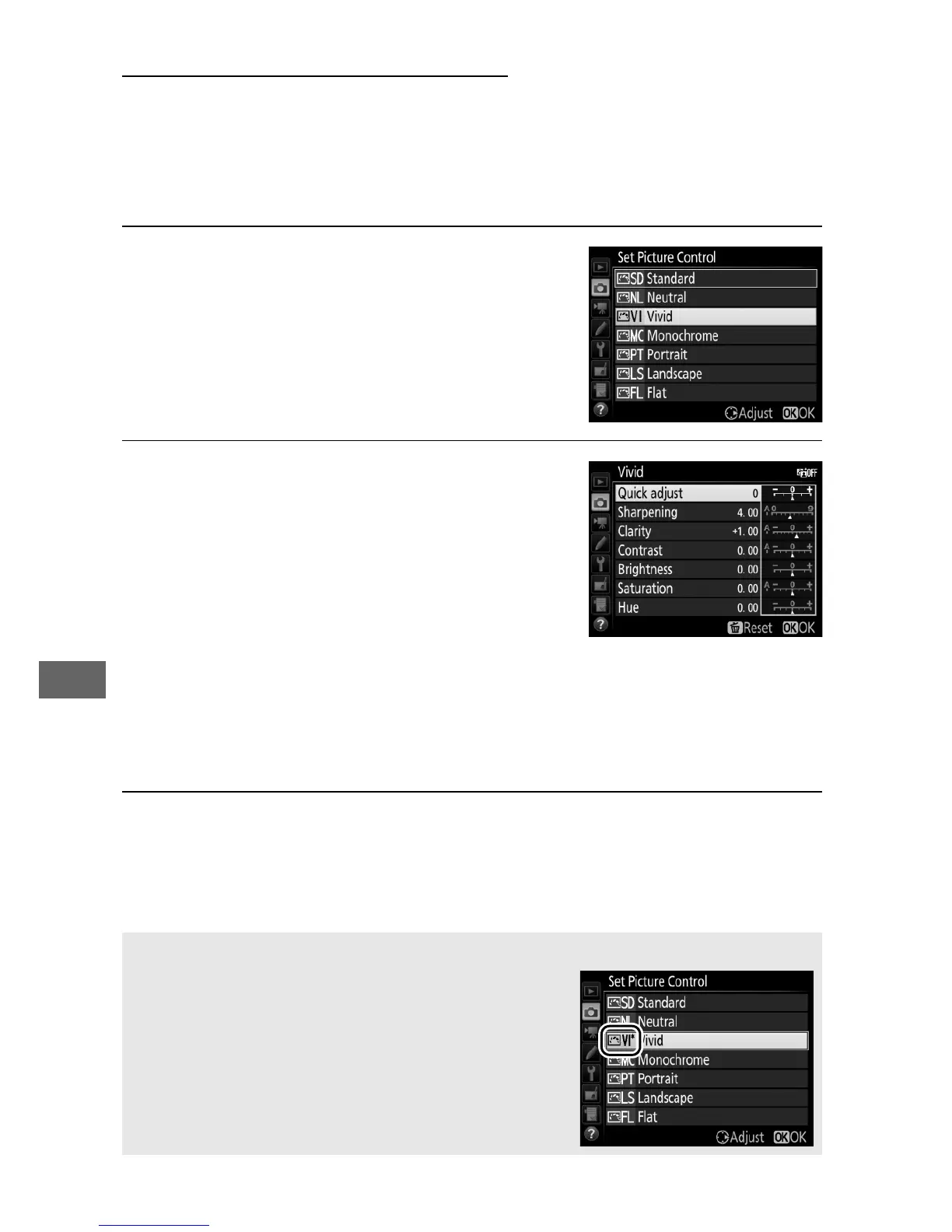 Existing preset or custom Picture Controls (0 135) can be