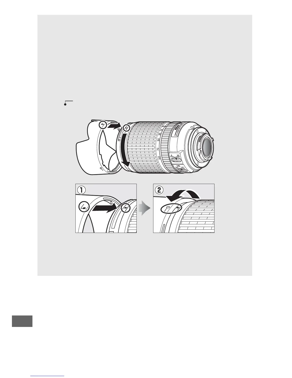 Align the lens hood mounting mark (●) with the lens hood alignment