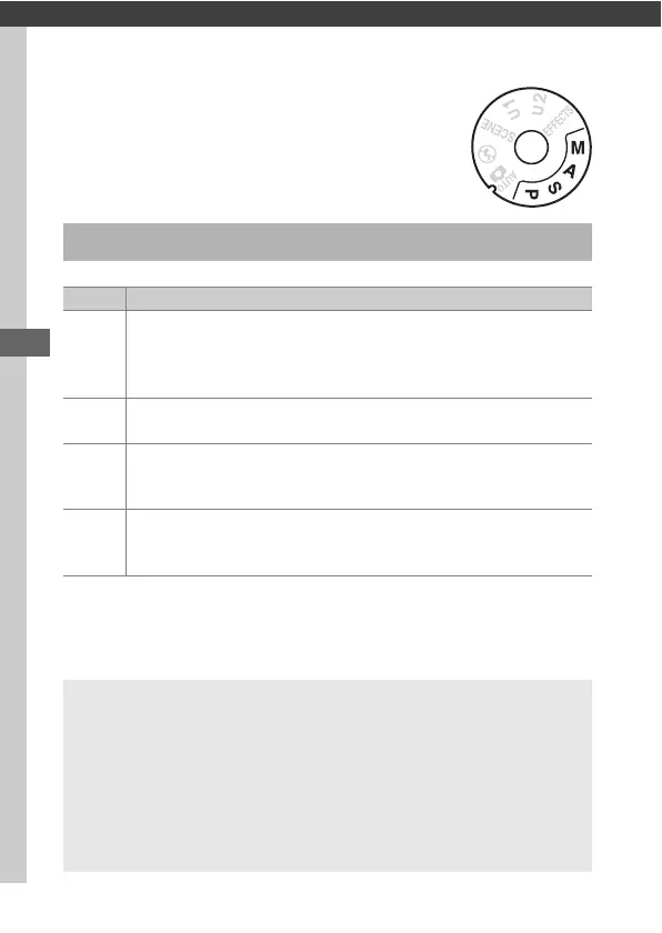 Shutter-priority auto (0 74): User chooses shutter speed; camera
