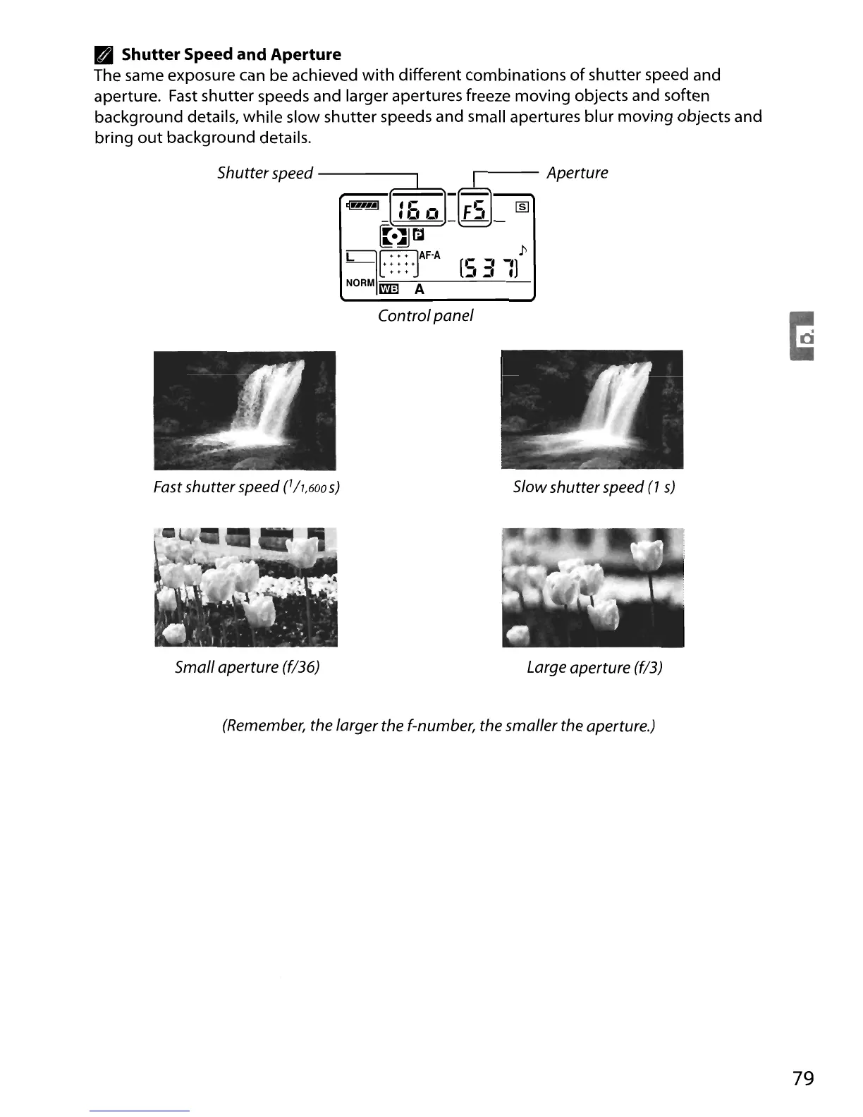 shutter speeds and larger apertures freeze moving objects and soften