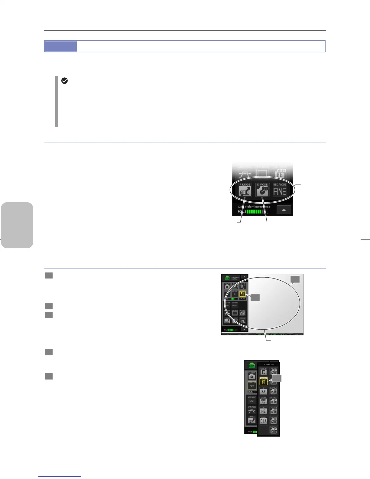 Registering the [F MODE] and [E MODE] buttons as function buttons of the [CAM MENU: CAMERA] long screen helps you