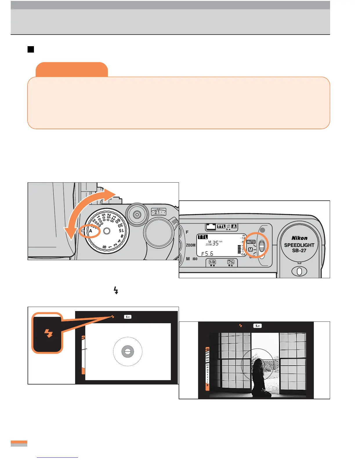 The following example shows the Nikon SB-27 Speedlight attached to the camera. For