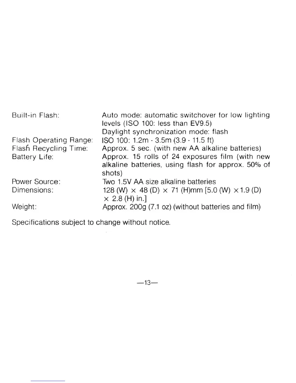 Battery Life: Approx. 15 rolls of 24 exposures film (with new
