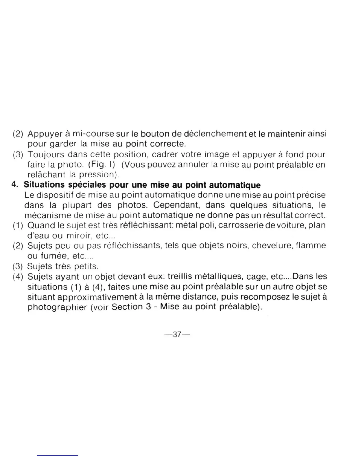 faire la photo. (Fig. I) (Vous pouvez annuler la mise au point prealable en
