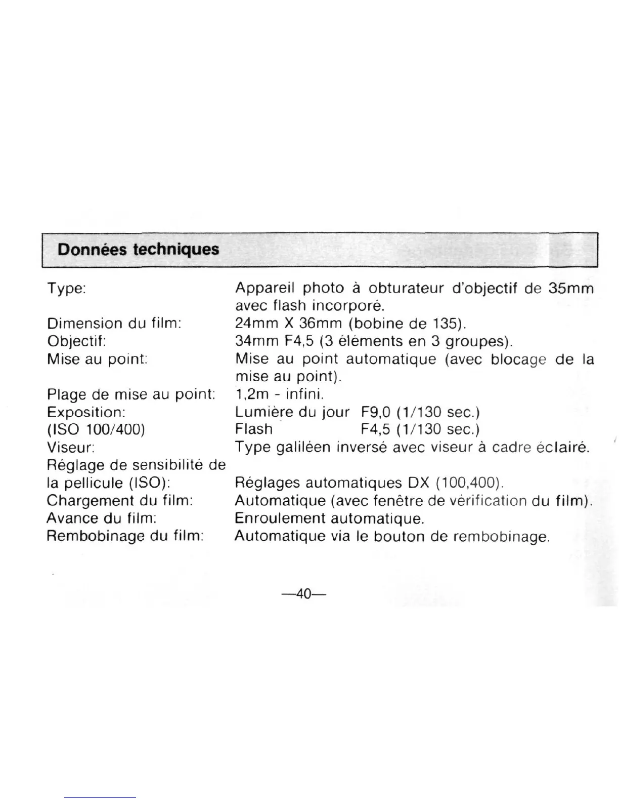 Objectif: 34mm F4,5 (3 elements en 3 groupes).