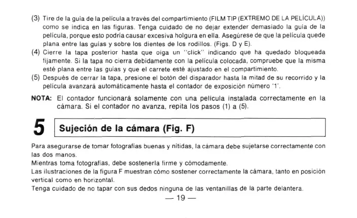 Las ilustraciones de la figura F muestran como sostener correctamente la camara, tanto en posicion