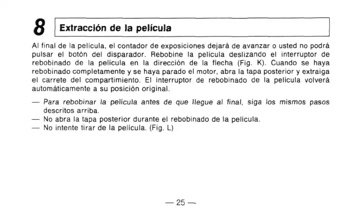 rebobinado de la pelicula en la direccion de la flecha (Fig. K). Cuando se haya