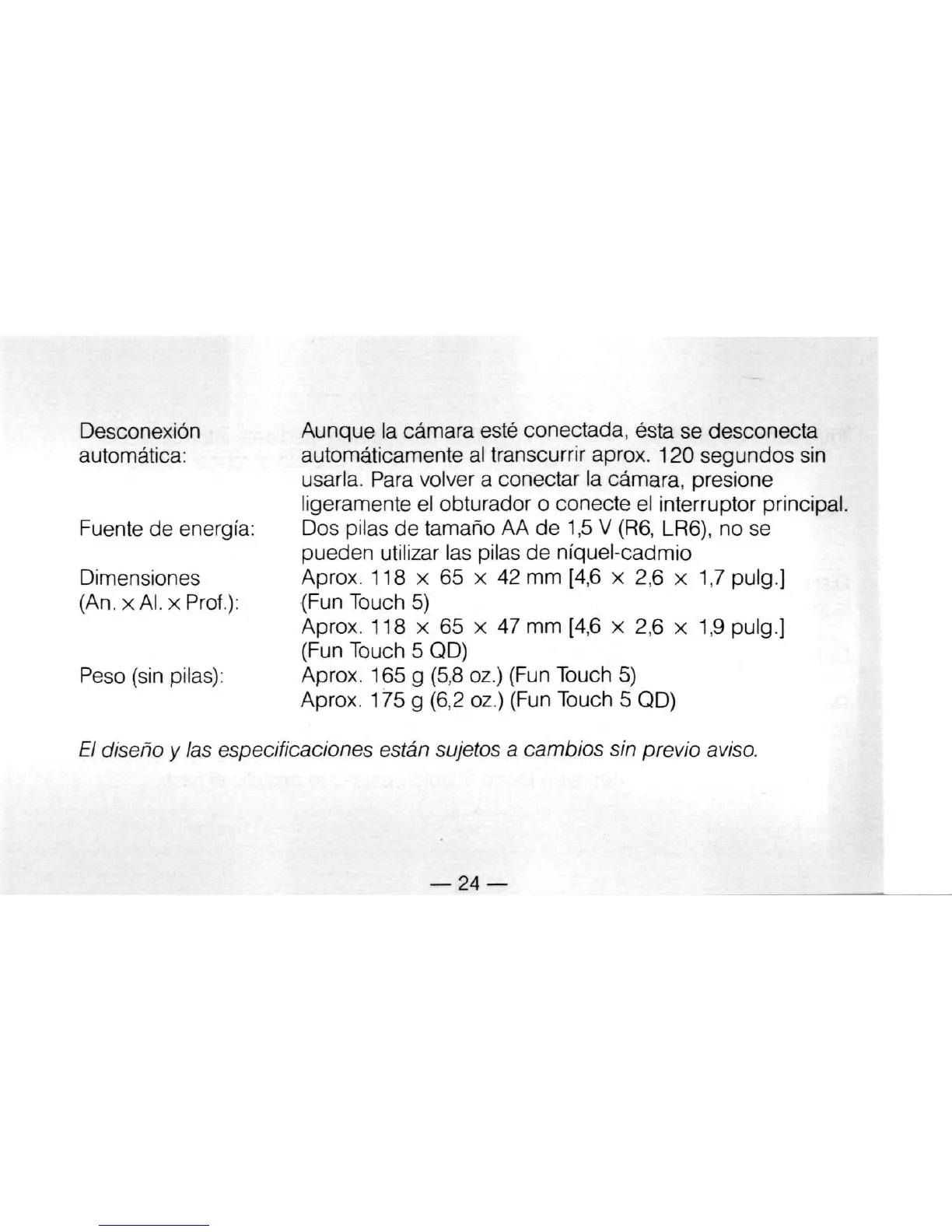 Peso (sin pilas): Aprox. 165 g (5,8 oz.) (Fun Touch 5)