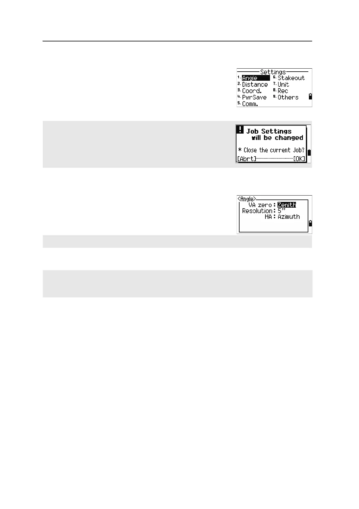 When this field is set to Azimuth, the horizontal angle (HA) that appears and recorded is in Azimuth value. When