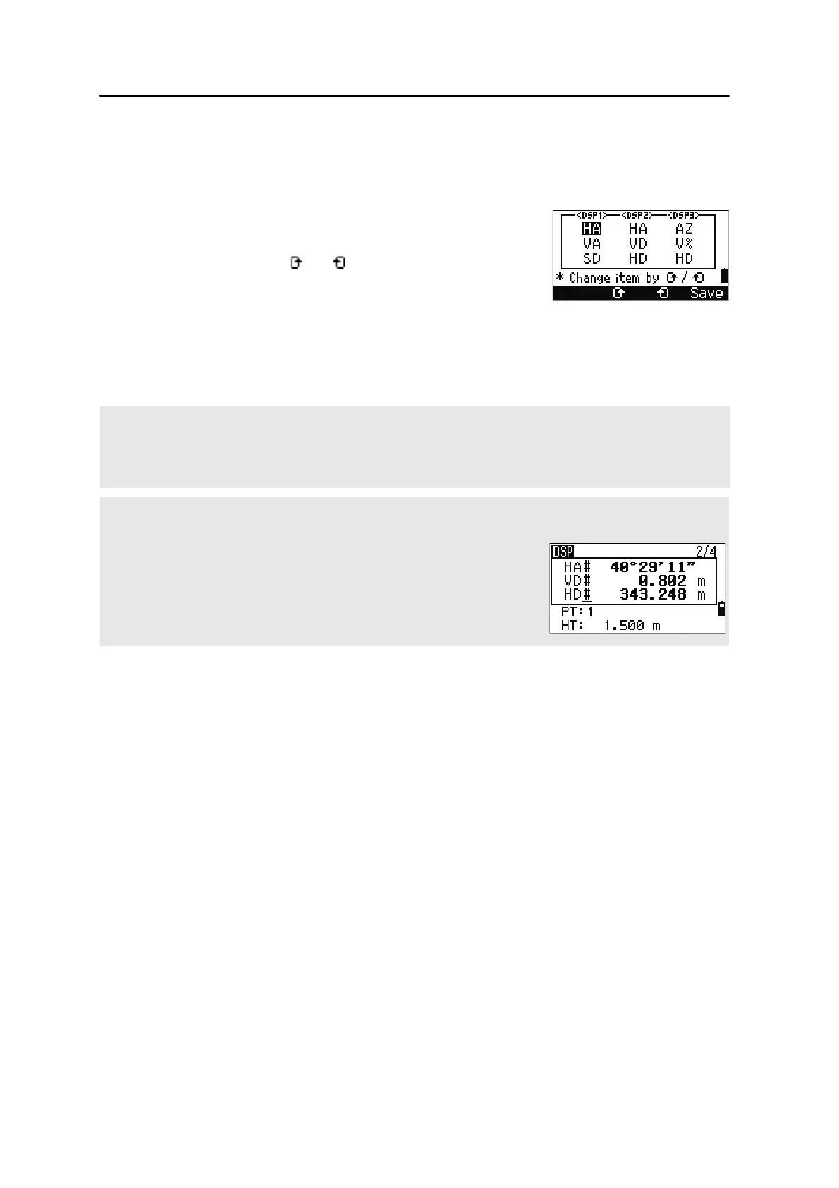 The items displayed in the DSP1, DSP2, DSP3, and DSP4 screens are also used in the corresponding Stakeout