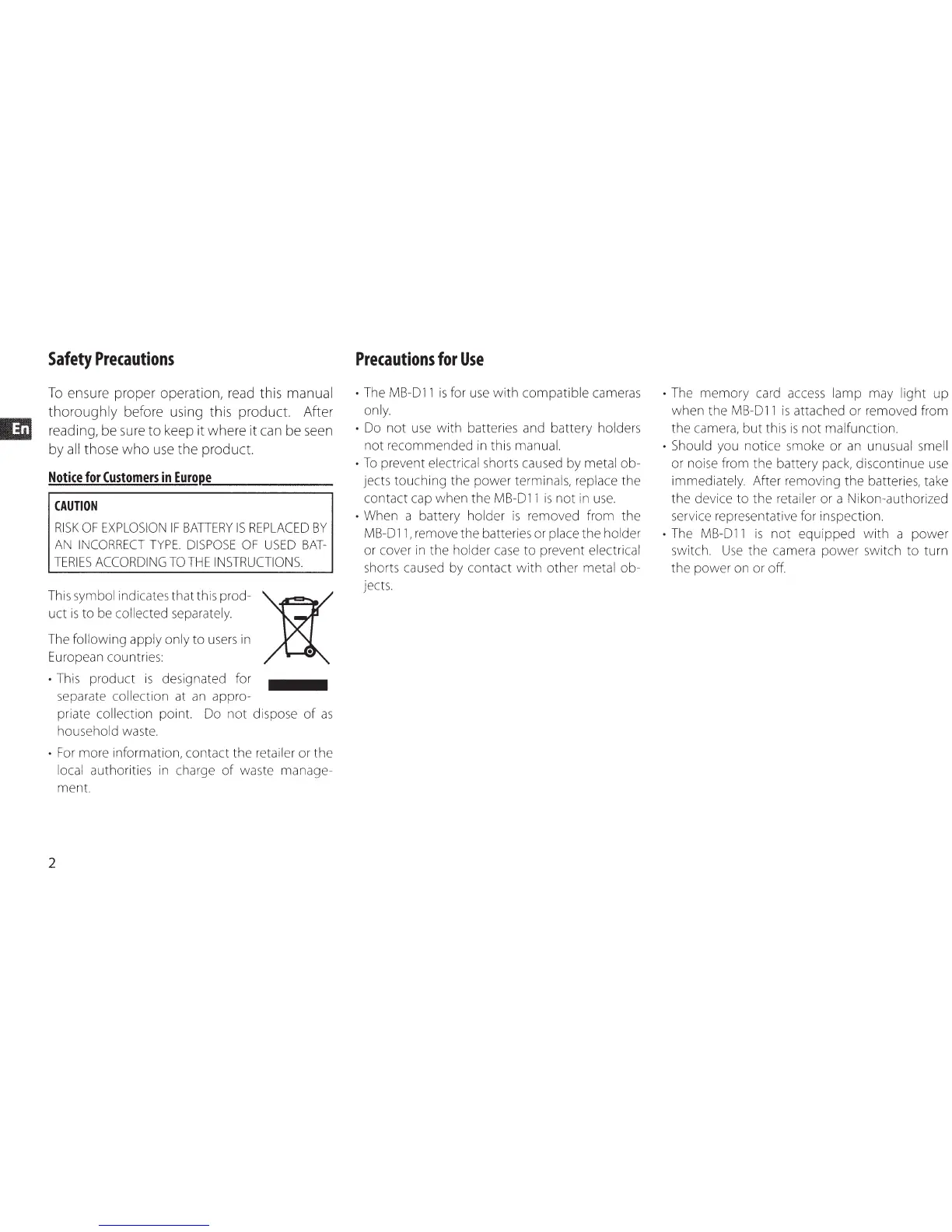 Nikon MB-D11 - Safety and Precautions; Precautions for Use