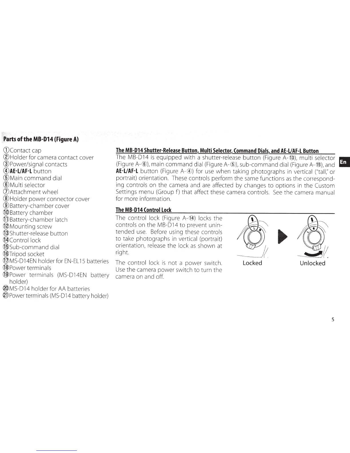 Nikon MB-D14 - MB-D14 Parts and Controls; Vertical Shooting Controls; Control Lock Functionality