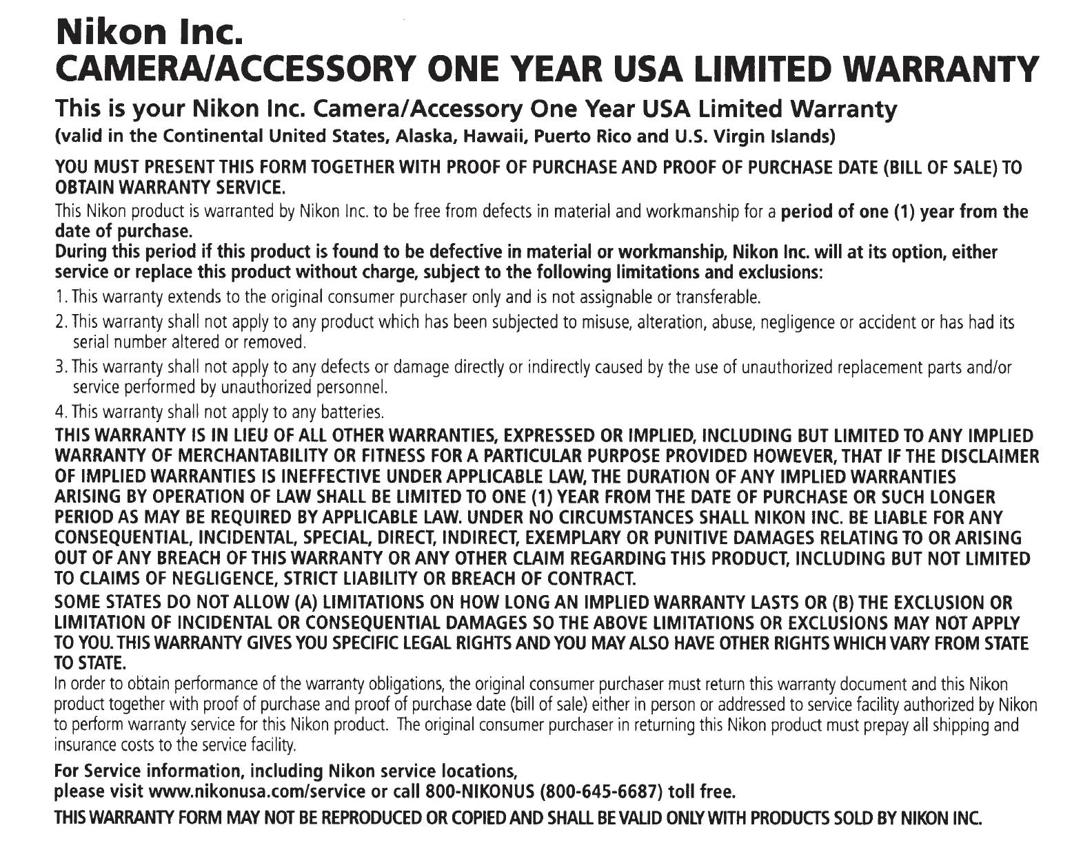 Nikon Inc. Camera/Accessory One Year USA Limited