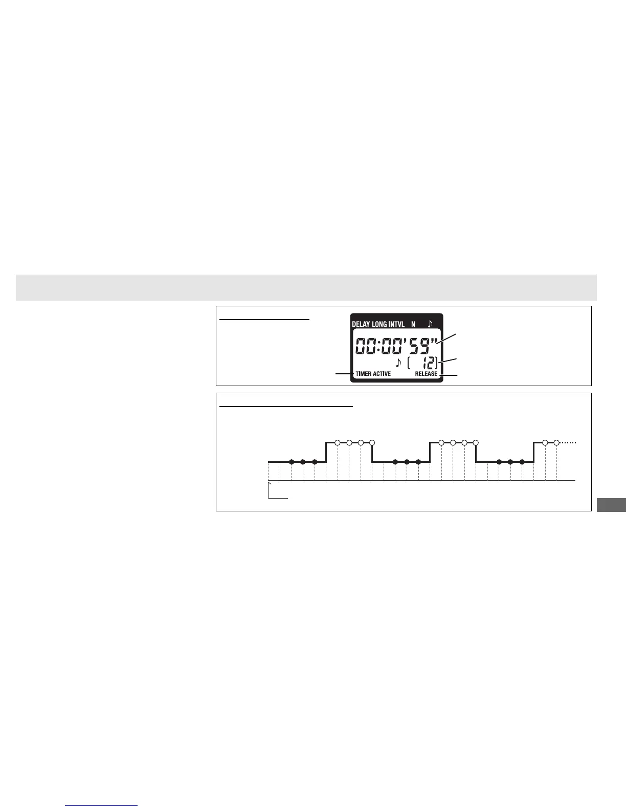 (「지연시간5 , 노광시간4 , 인터벌9 초」 로설정한경우 .●는전자음이울리는 ,○는릴리즈