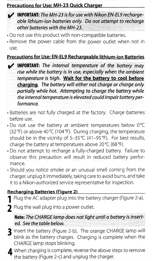 Nikon MH-23 - MH-23 Quick Charger Precautions; Compatibility; EN-EL9 Battery Precautions; Battery Temperature During Charging