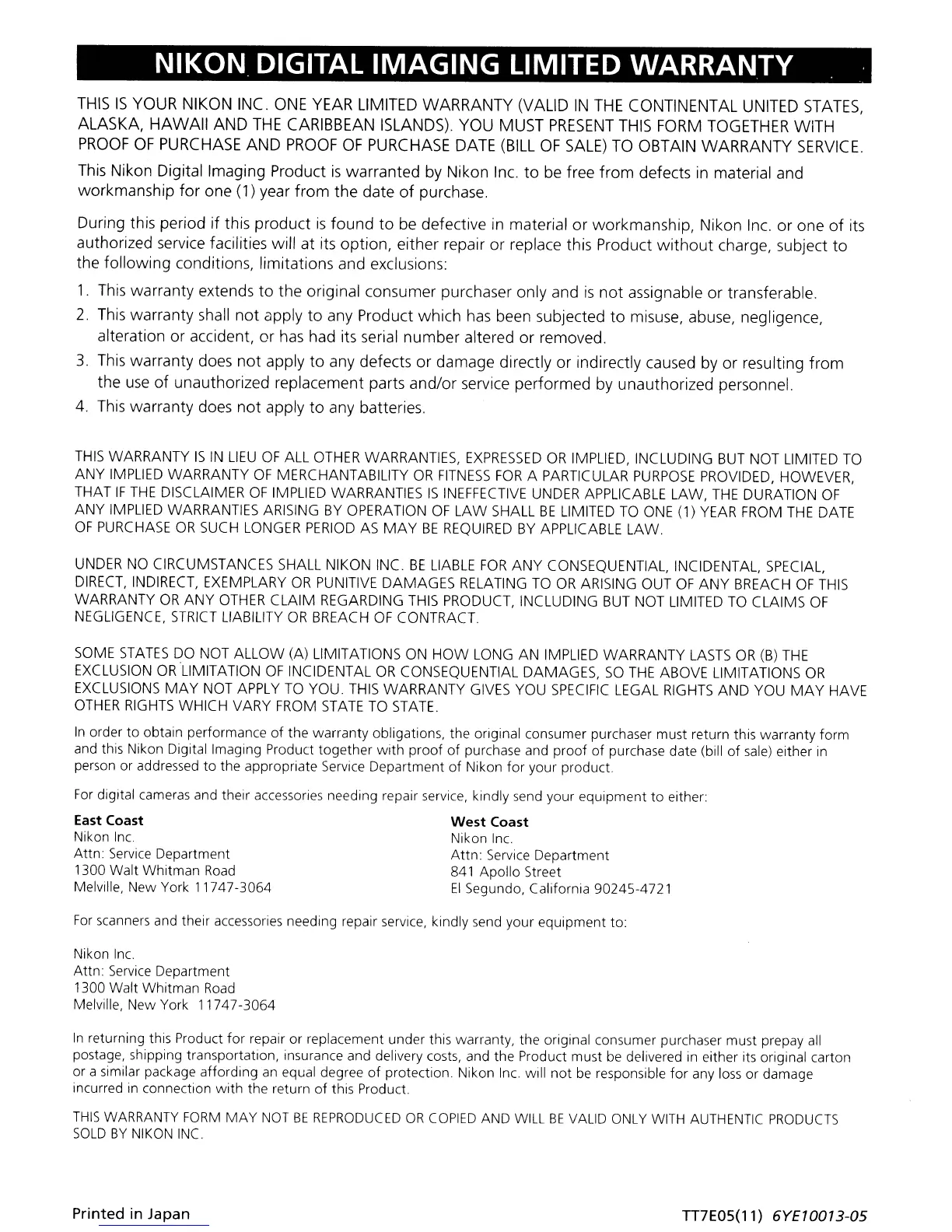 NIKON DIGITAL IMAGING LIMITED WARRANTY .