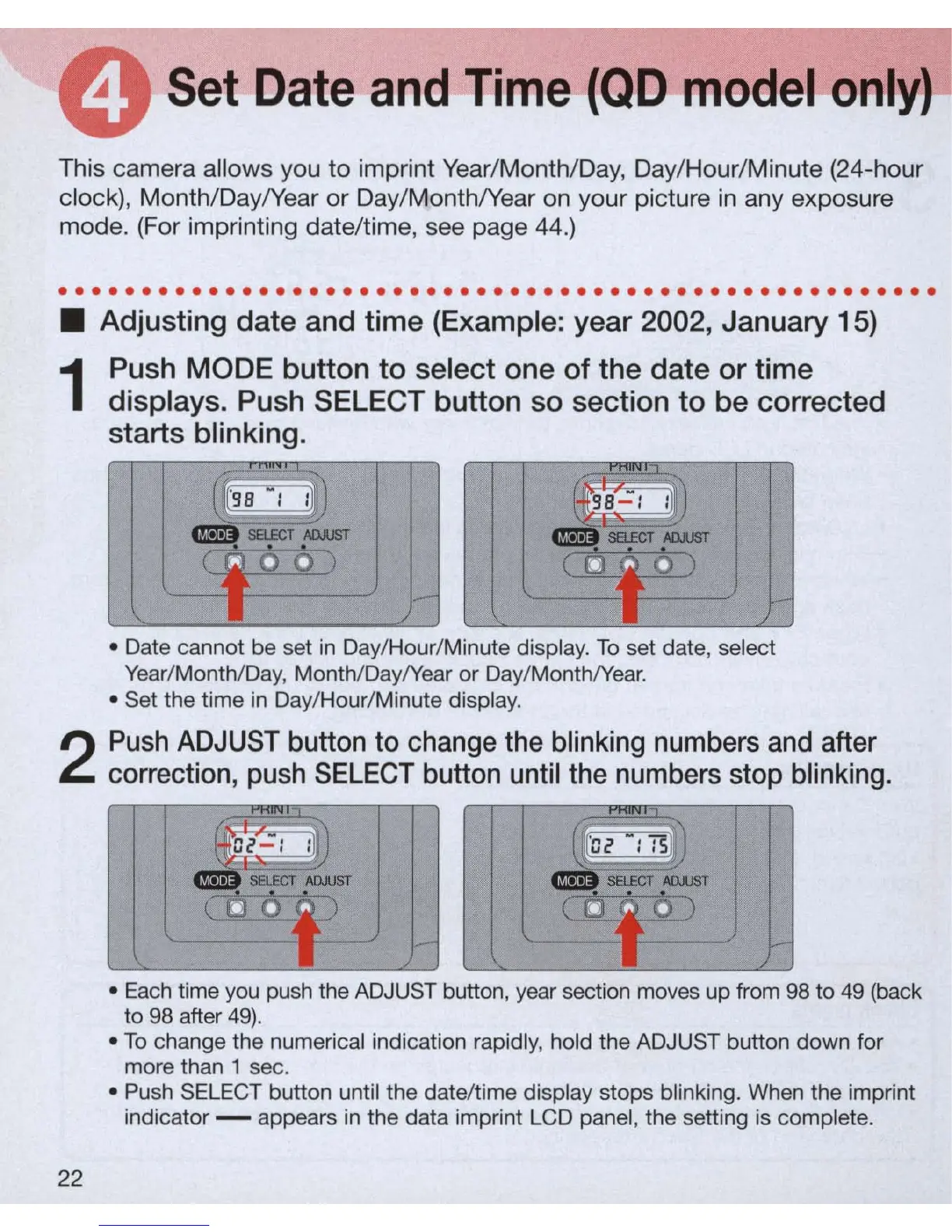 • Push SELECT button until the date/time display stops blinking. When the imprint