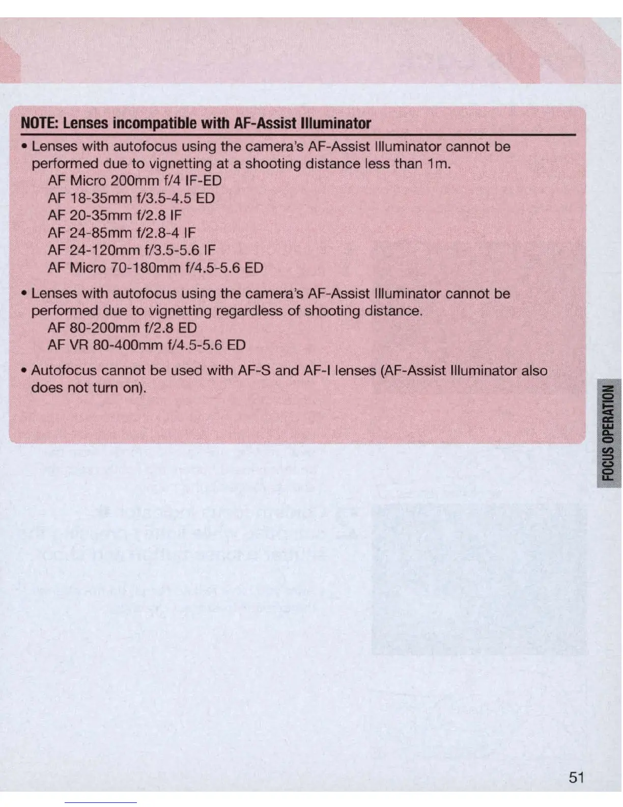 • Autofocus cannot be used with AF-S and AF-I lenses (AF-Assist Illuminator also