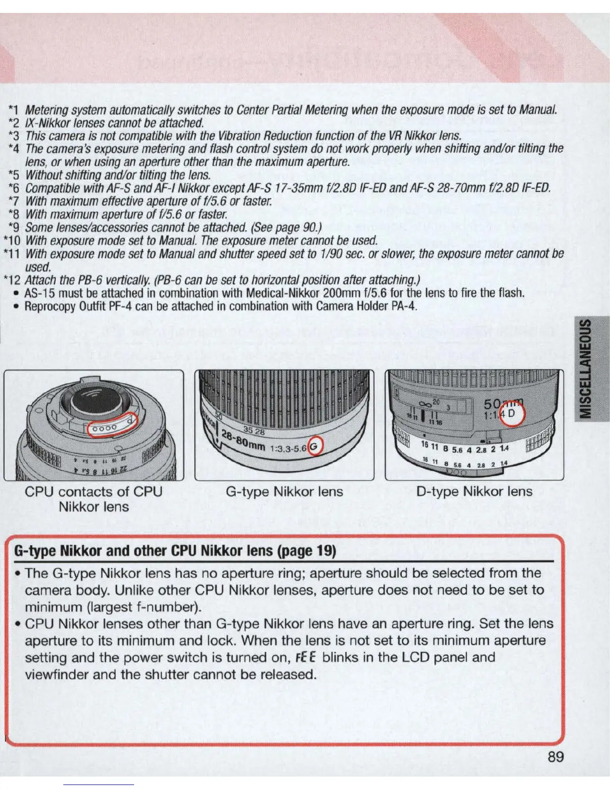 • CPU Nikkor lenses other than G-type Nikkor lens have