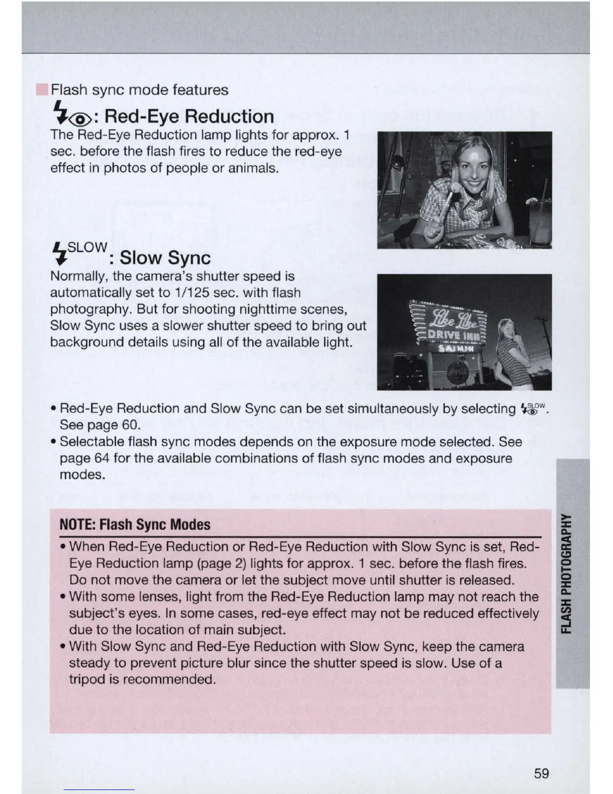 • Selectable flash sync modes depends on the exposure mode selected. See