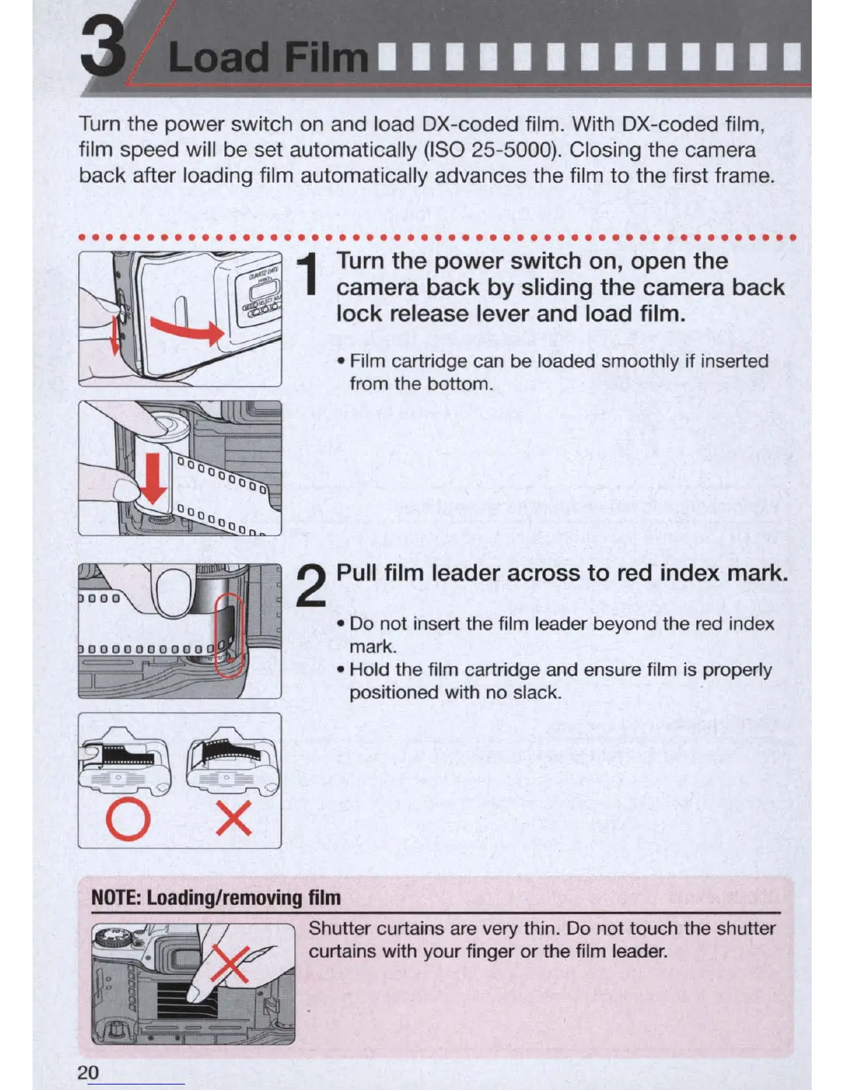 • Do not insert the film leader beyond the red index
