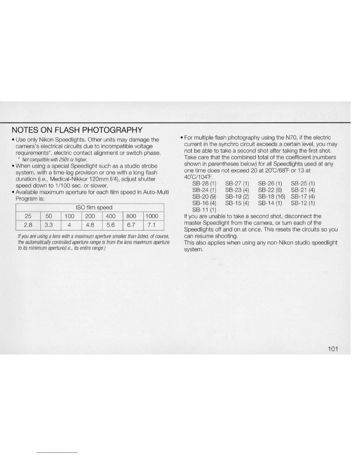 • For multiple flash photography using the N70,