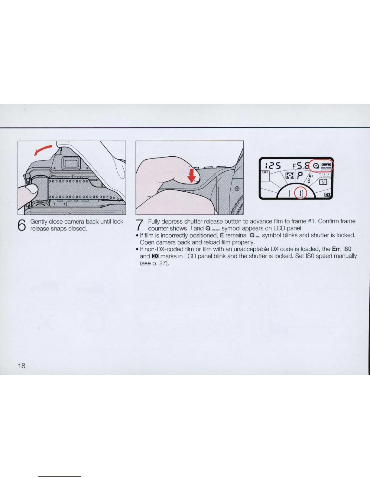 incorrectly positioned, E remains, (!) _ symbol blinks and shutter is locked.