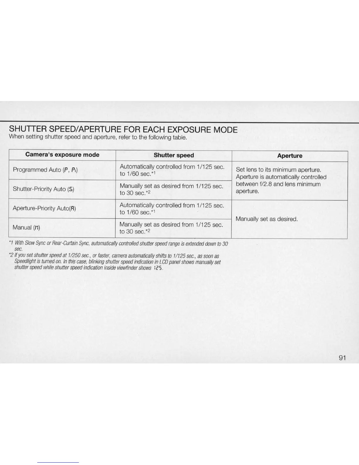 SHUTTER SPEED/APERTURE FOR EACH EXPOSURE MODE