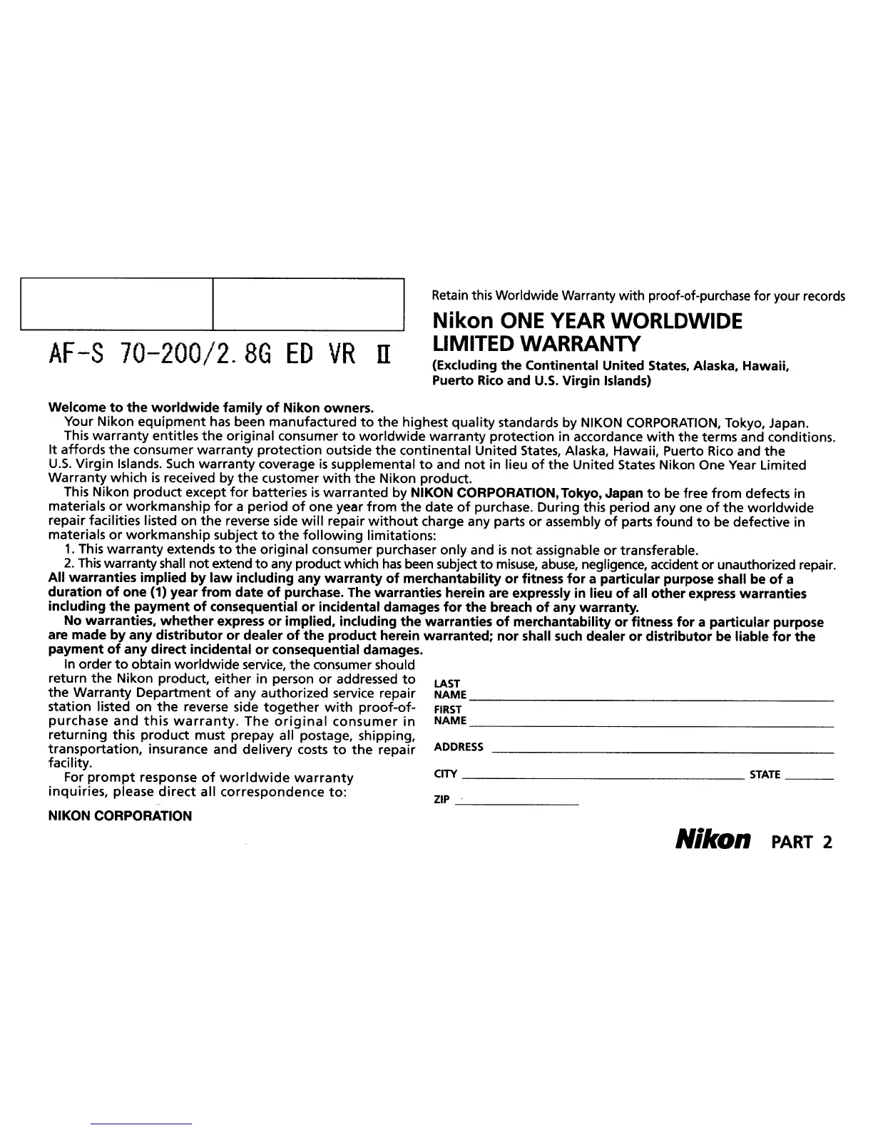 warranted by NIKON CORPORATION, Tokyo, Japan