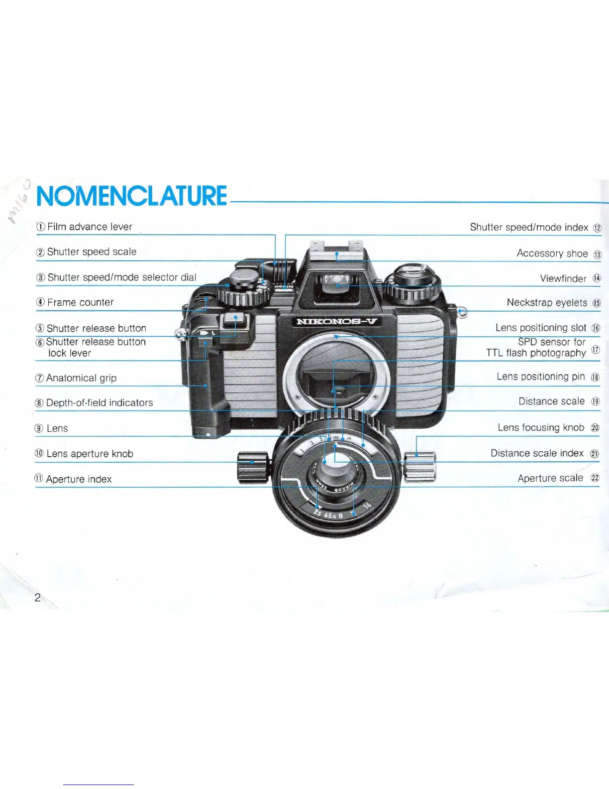 Nikon Nikonos-V - Nikonos-V Camera Nomenclature; Film Advance and Shutter Controls; Lens and Focusing Controls; Viewfinder and Accessory Mount