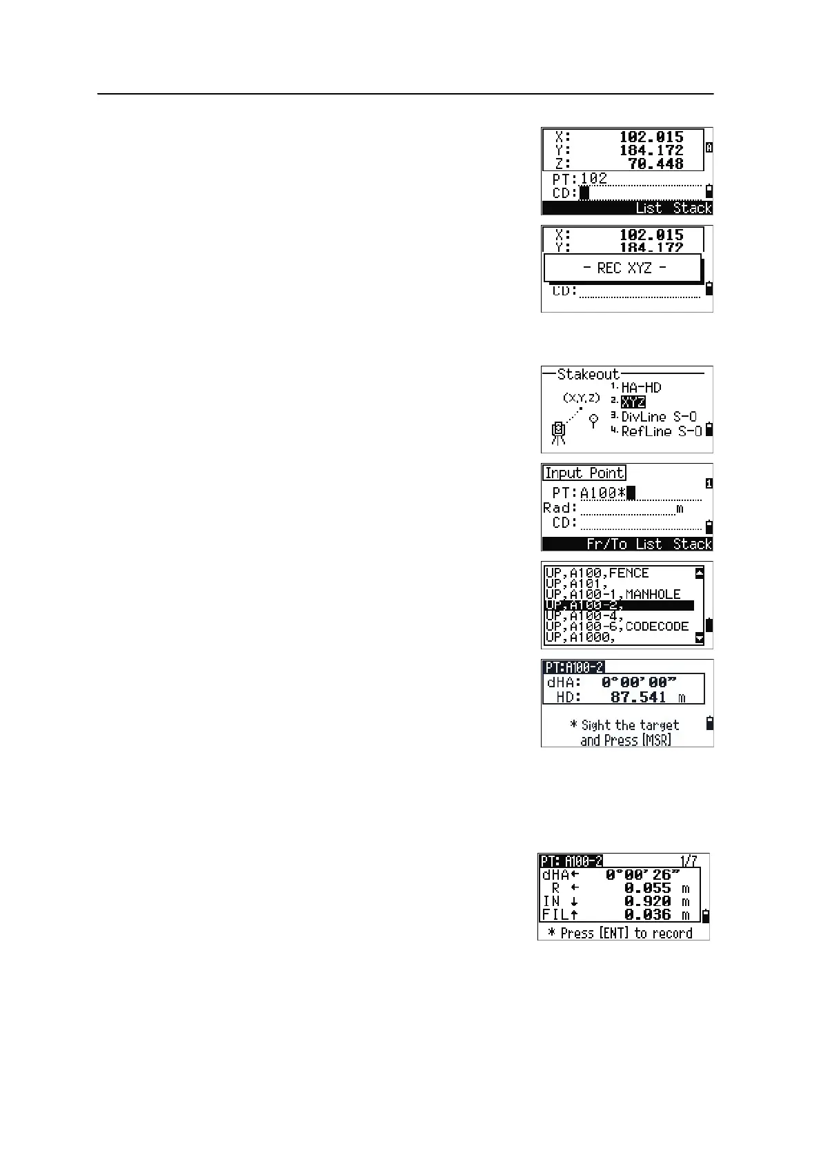 To record the stakeout point, press [ENT]. PT defaults to
