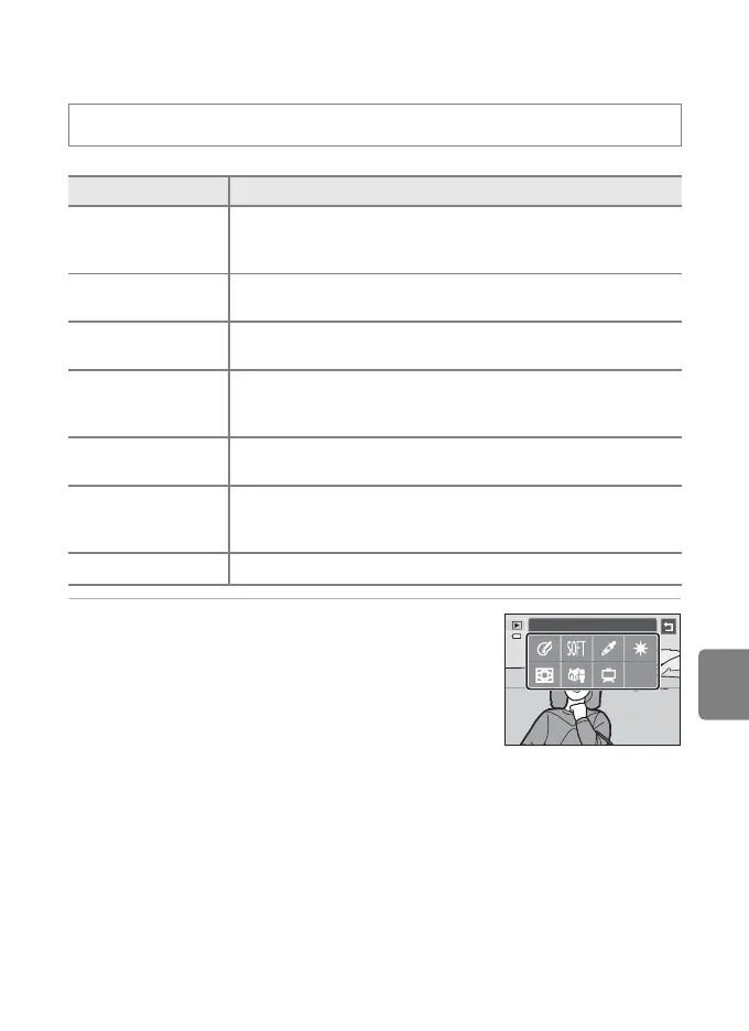 c button (playback mode) M Tap the d tab M Tap M Retouch M i Filter effects