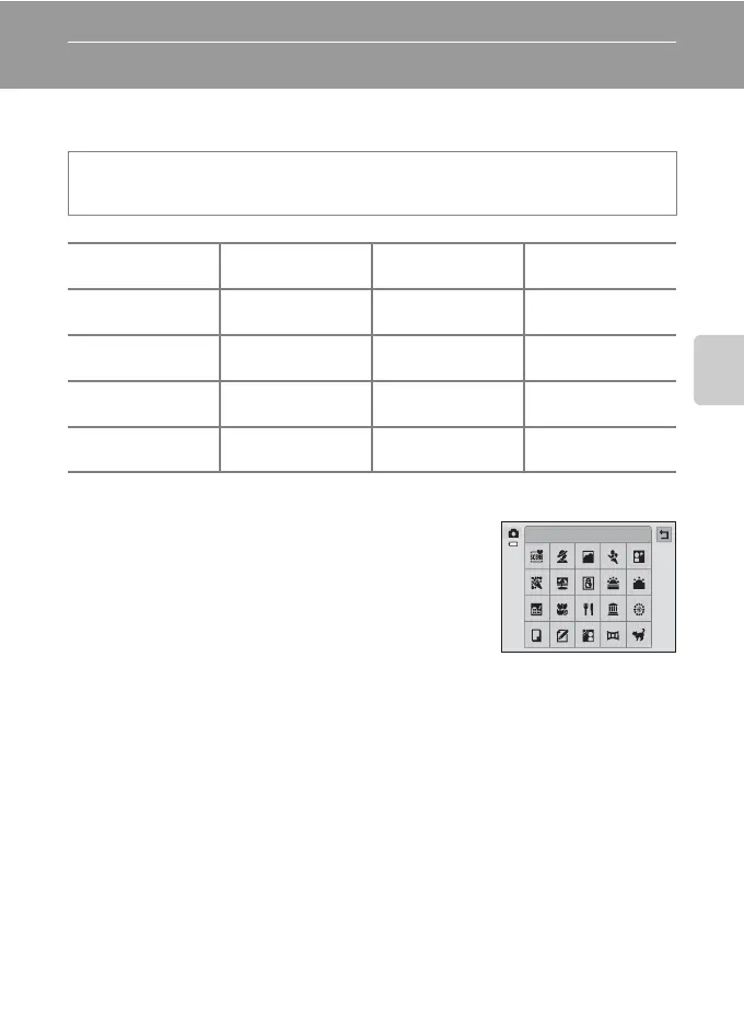 When one of the following scenes is selected, camera settings are automatically