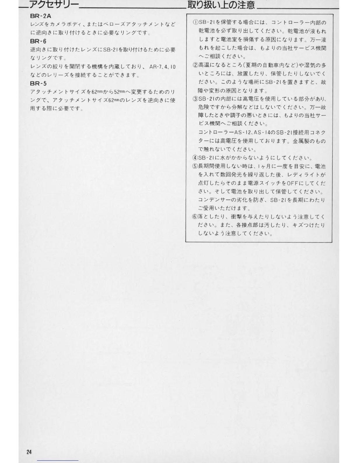 Nikon SB-21 - Accessories and Handling Precautions; Lens Mounting Rings (BR-2 A, BR-5, BR-6); General Handling Precautions; Storage and Environmental Care Guidelines