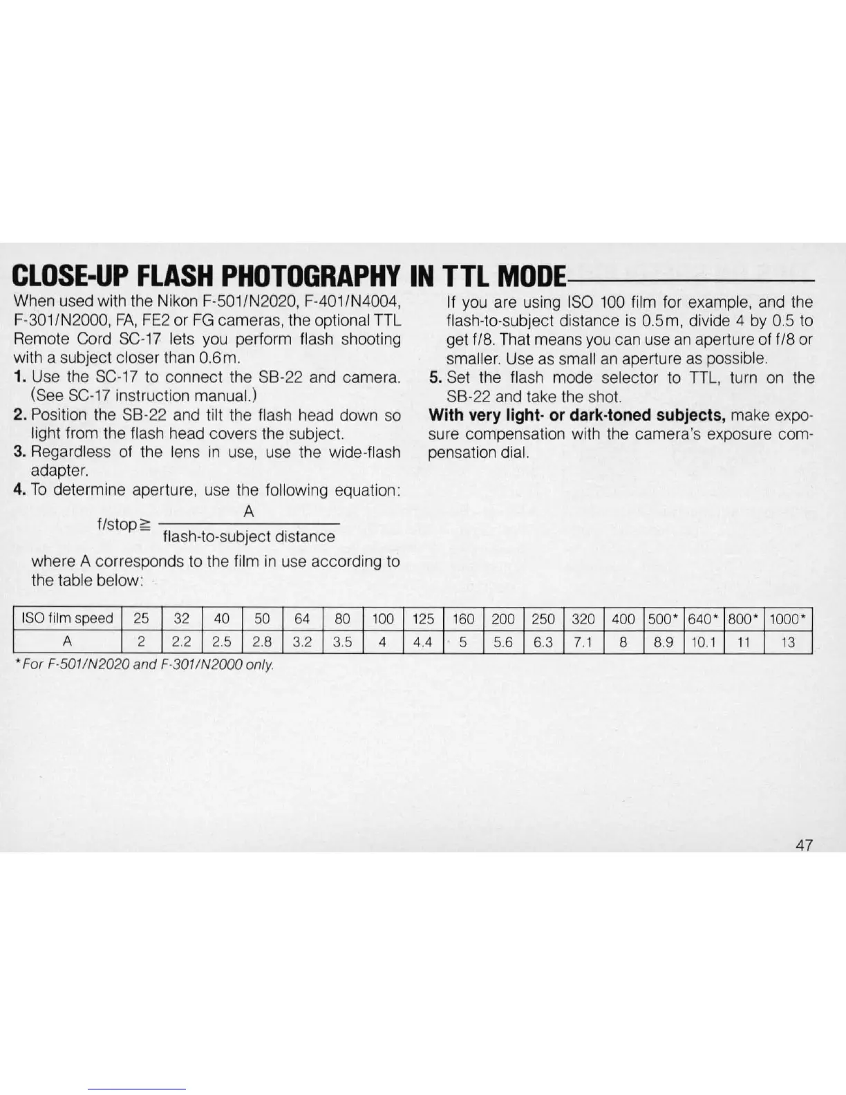 When used with the Nikon F-S01/N2020, F-401/N4004,