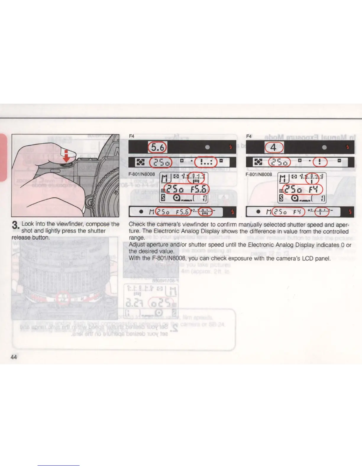 Adjust aperture and/or shutter speed until the Electronic Analog Display indicates 0 or