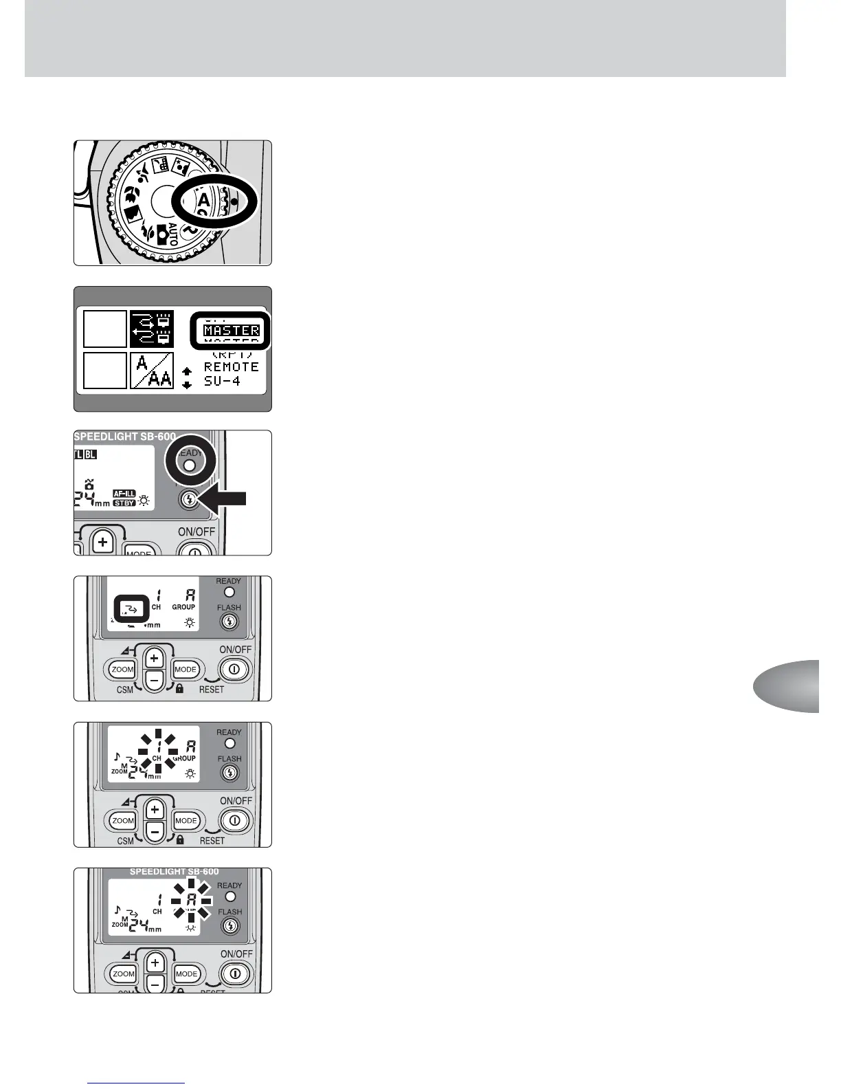 • Set the remote flash unit A to group A and the remote