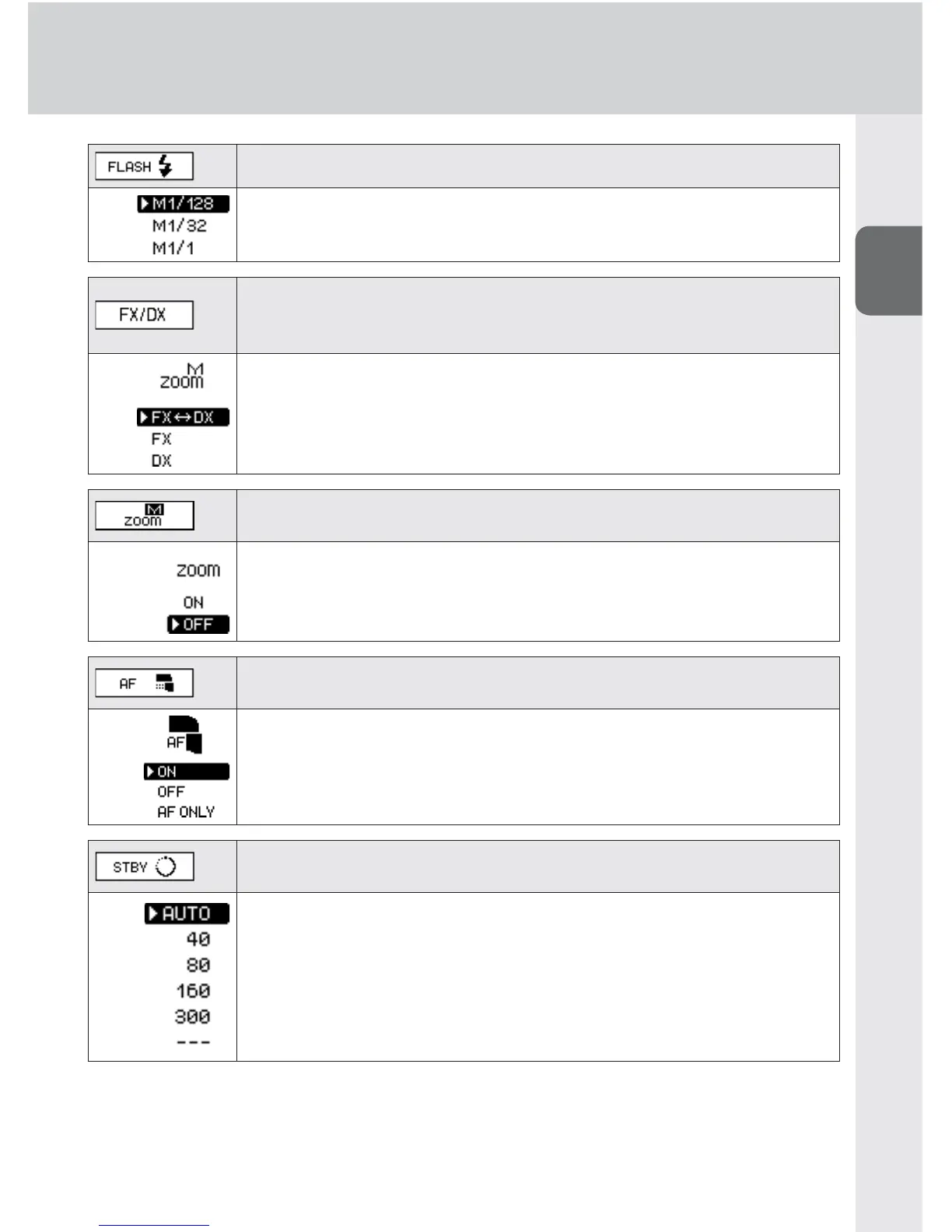 OFF: AF-assist illumination canceled, fl ash function activated