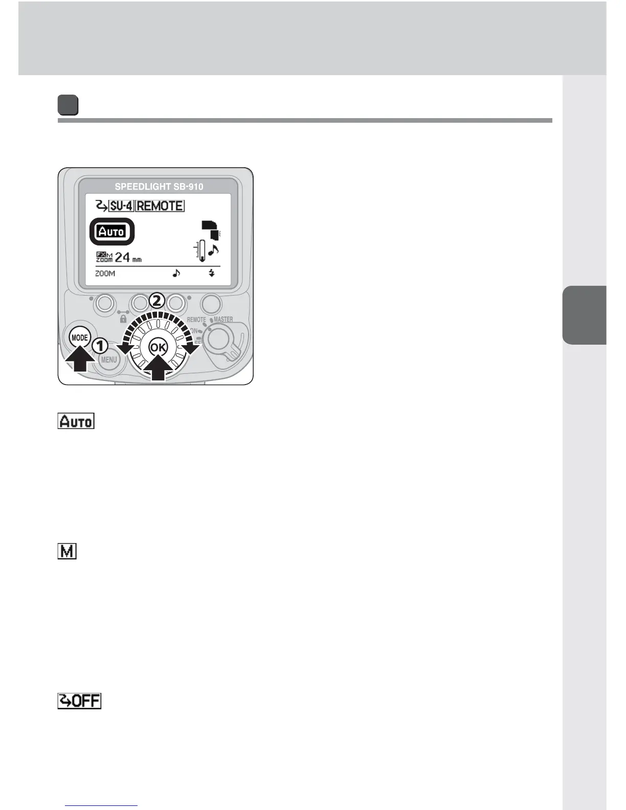 When used in remote mode, the SB-910 can operate in AUTO (auto), M (manual)